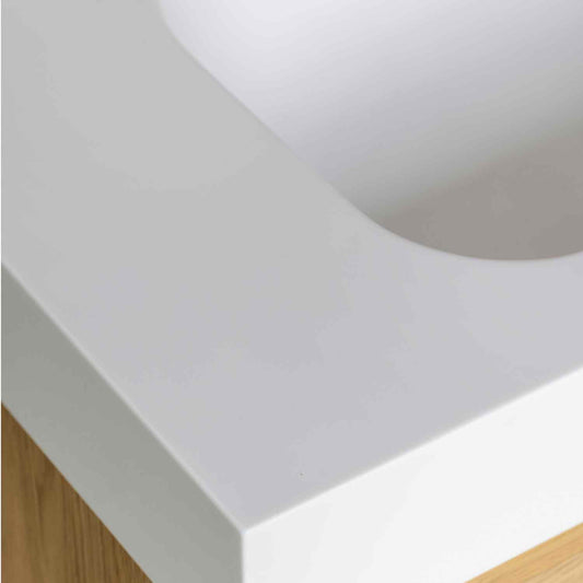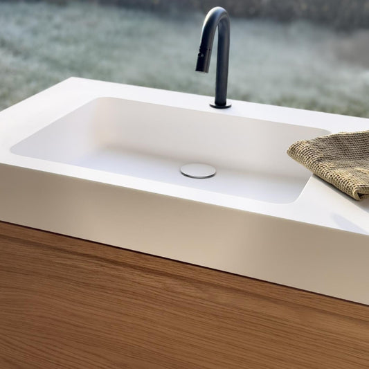 Le matériau des vasques et crédences est réputé pour sa résistance exceptionnelle. Il est prévu pour une utilisation quotidienne et conservera son aspect d'origine au fil du temps. Le Solid Surface ne jaunit jamais, sa couleur est stable et il résiste aux UV.
